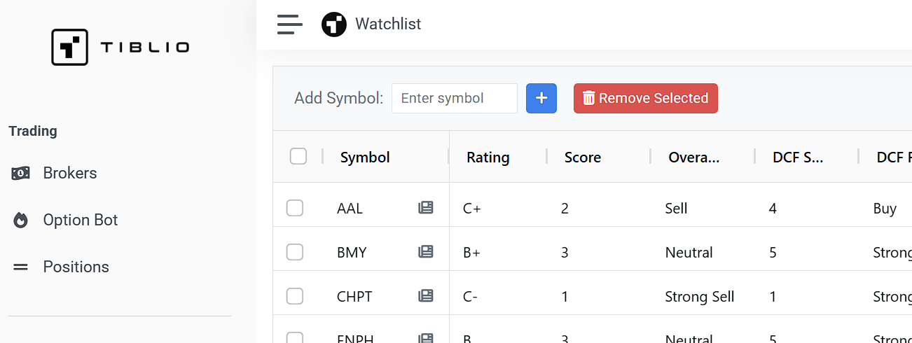 The watchlist transforms your Tiblio experience from overwhelming to focused. Filter by watchlist symbols to see only relevant opportunities. Track fundamental data for your core holdings. Receive automated alerts about important events.